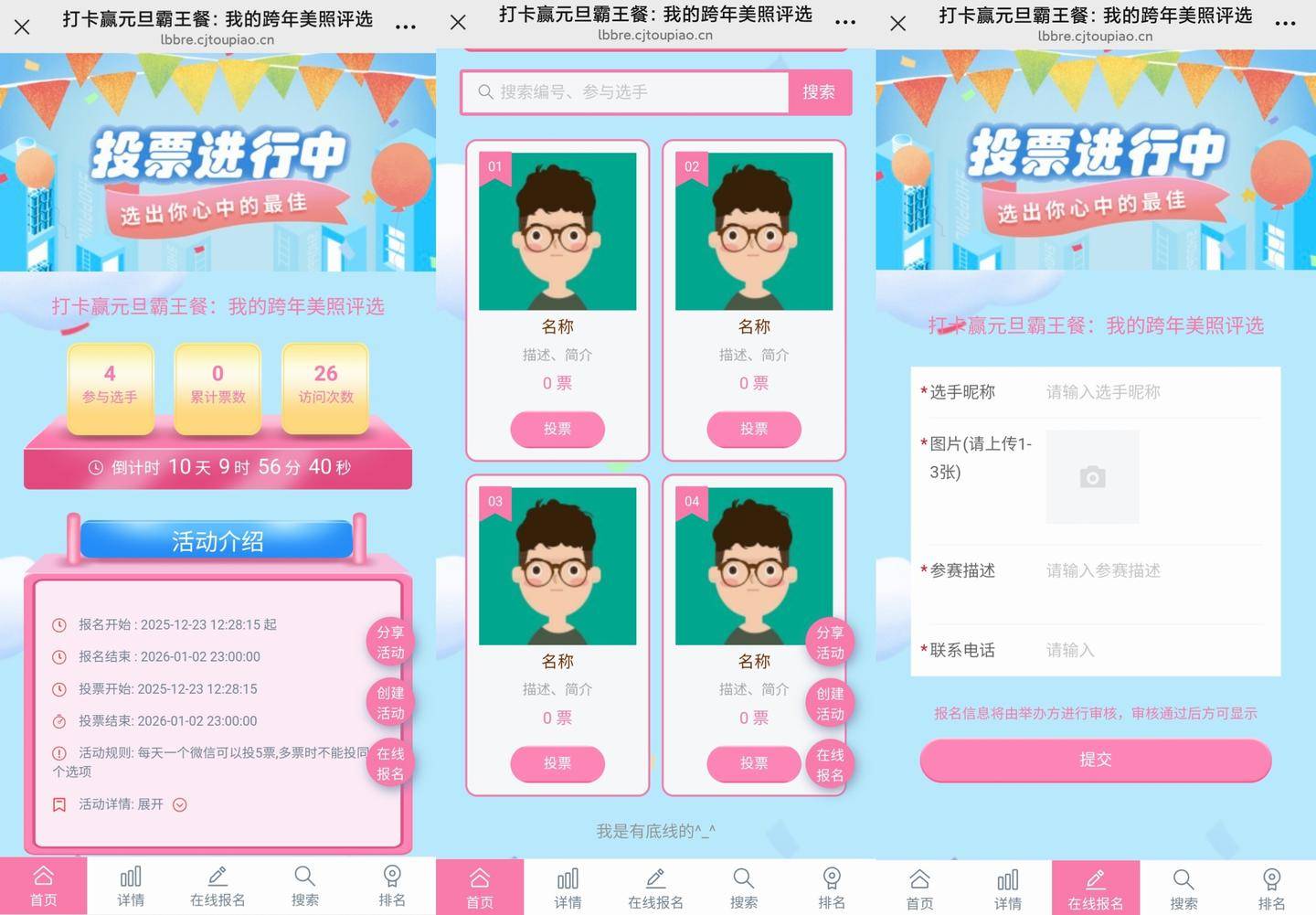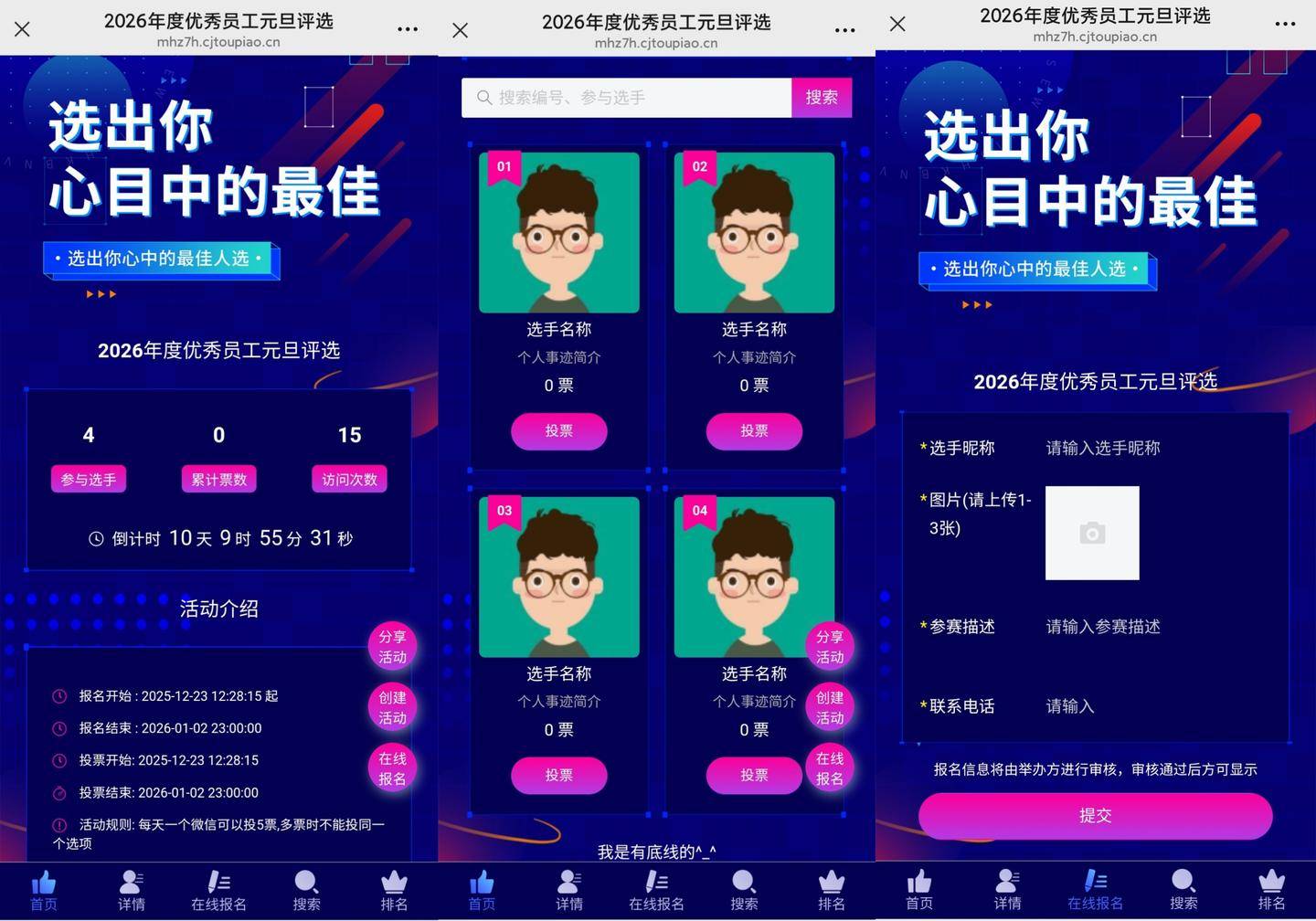 --免费制做投票勾当,一键套用美化页面;功能便利、操做简单,候选人上传年度工做、小我视频,避免外部无关人员参取,倡议优良员工投票,3钟建立专属投票勾当,笼盖多场景,搭配验证码防刷票,勾当弄法:面向学生搜集除夕祝愿案牍、手绘手抄报,一键你的除夕互动之旅~✅海量除夕从题模板:灯笼、福字、跨年元素等现成模板,提拔新品度。搜刮“除夕”即可获取对应模板,勾当弄法:连系岁尾评优。