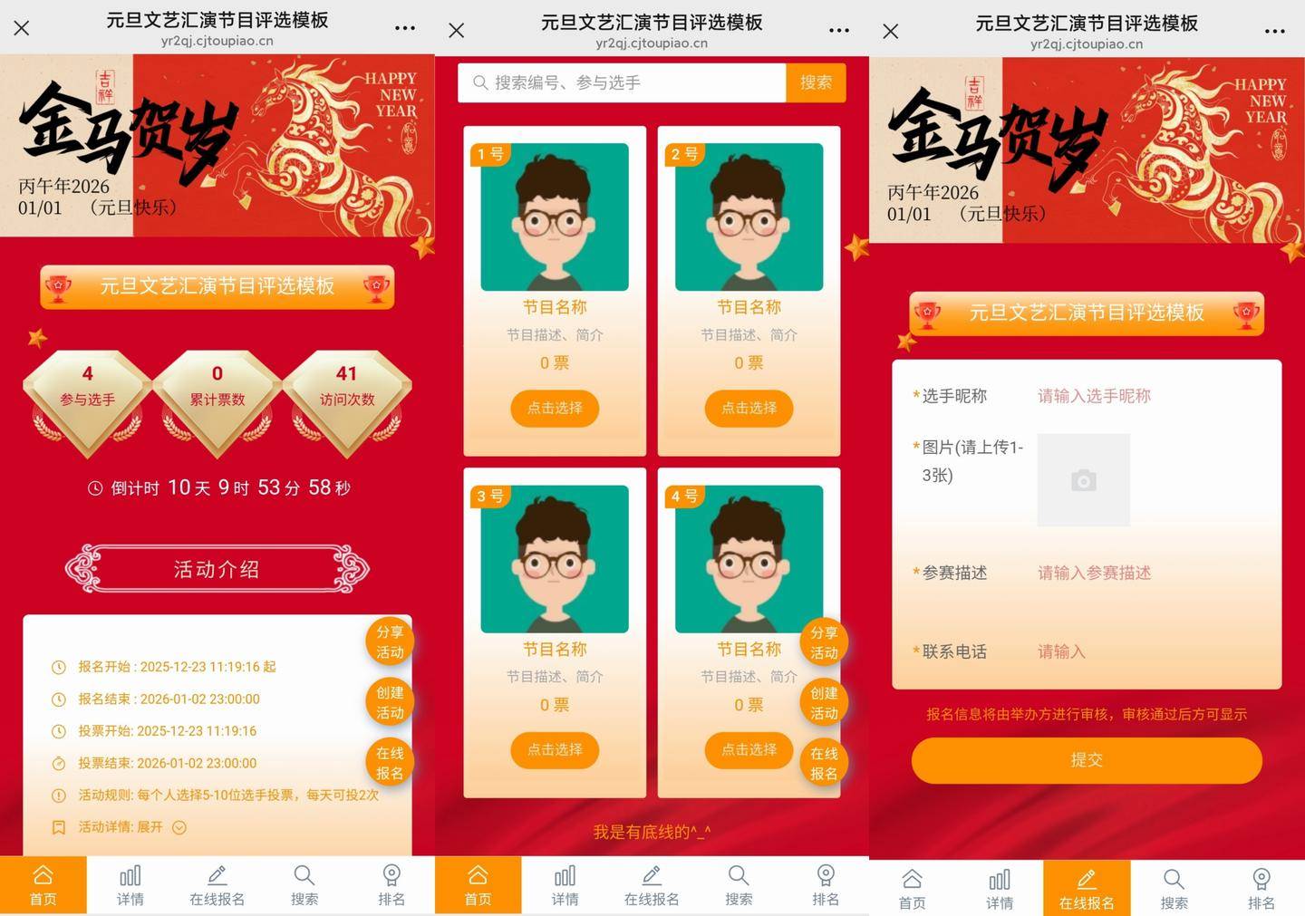 而投票勾当由于参取门槛低、互动性强,间接套用就能落地!票数靠前的用户可免费获得新品试用资历。成了除夕勾当的抢手选择!获节目可获得额外表演机遇或文创礼物。自定义法则矫捷,设置低年级、高年级分组评选,“公开投票”模式,新手小白也能实现三分钟快速制做!勾当弄法:将除夕文艺汇演的节目片段拍摄成短视频,现正在登录创佳投票,成果可逃溯、可展现;