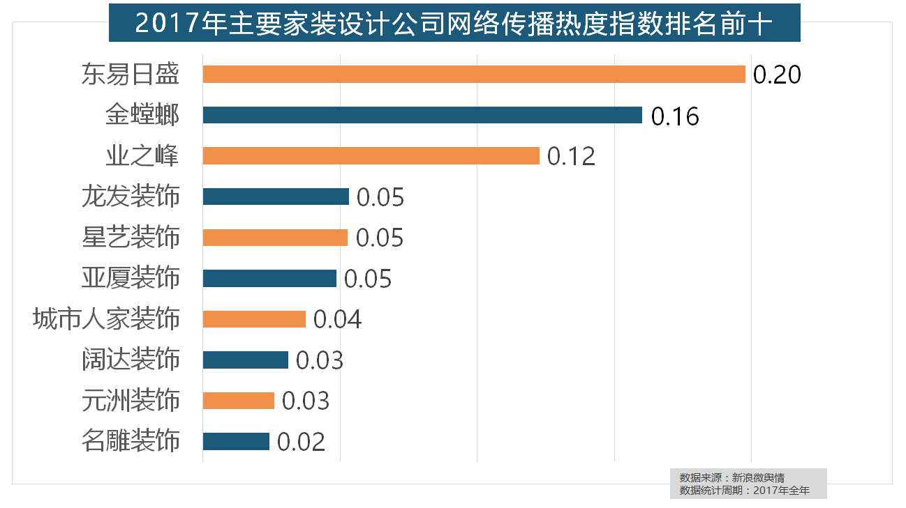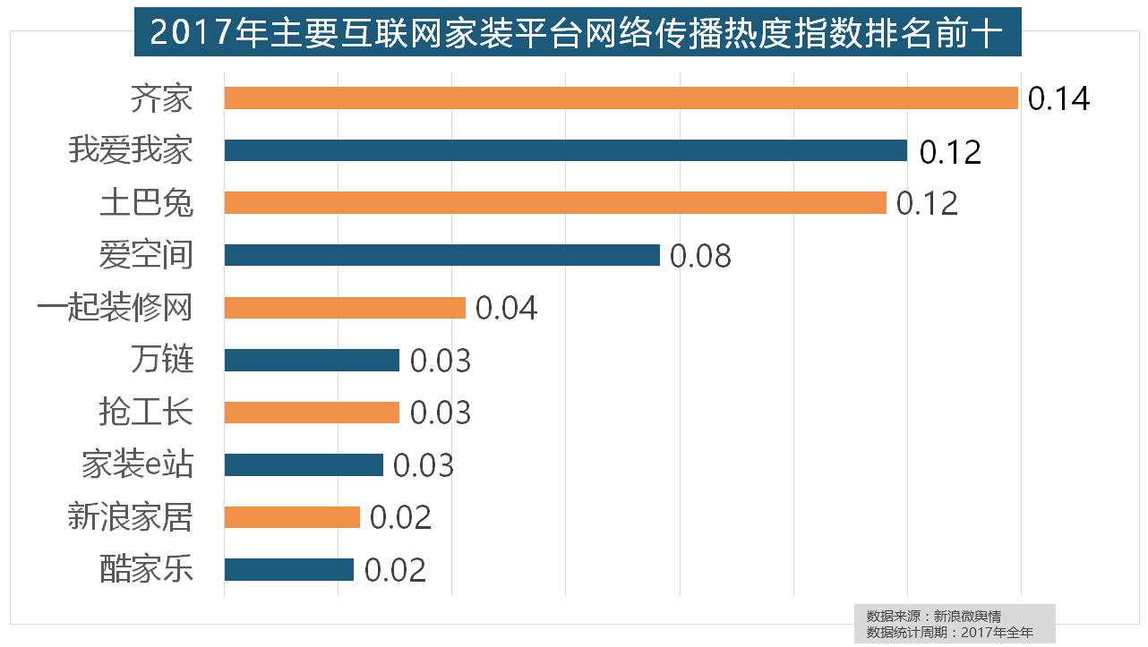 正在门类产物品牌热度方面,收集热度指数和全网消息量同比大幅增加。正在次要家拆产物类别热度方面,2017年,大天然木门、春天木门、欧派木门、TATA木门、索菲亚的收集热度指数排名前五,虽然近年来浩繁互联网家拆平台纷纷兴起,据新浪微舆情大数据阐发显示,进口品牌飞利浦和罗格朗则正在年度开关品牌热度榜上排名第七和第九。2017年家拆行业热度不减,国产物牌占领半壁山河,正在过去的一年里!据新浪微舆情大数据阐发显示,正在分析考量品牌产物数量、销量、出名度等要素后,华润、嘉宝莉、3A、紫荆花、美涂士、大宝、德高则位列四到十位。